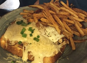 Richard had Chicken Croque Madame: Grilled chicken breast, ham, Havarti, swiss fondue, fried egg, honey mustard, served open faced on toasted sourdough. He said it was the best meal he’d had in Alabama. I’m sure he means besides the meals I’ve cooked, right? 😉😉😉