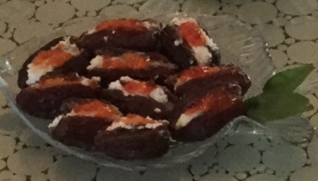 Medjool Dates stuffed with goat cheese and topped with red pepper spread