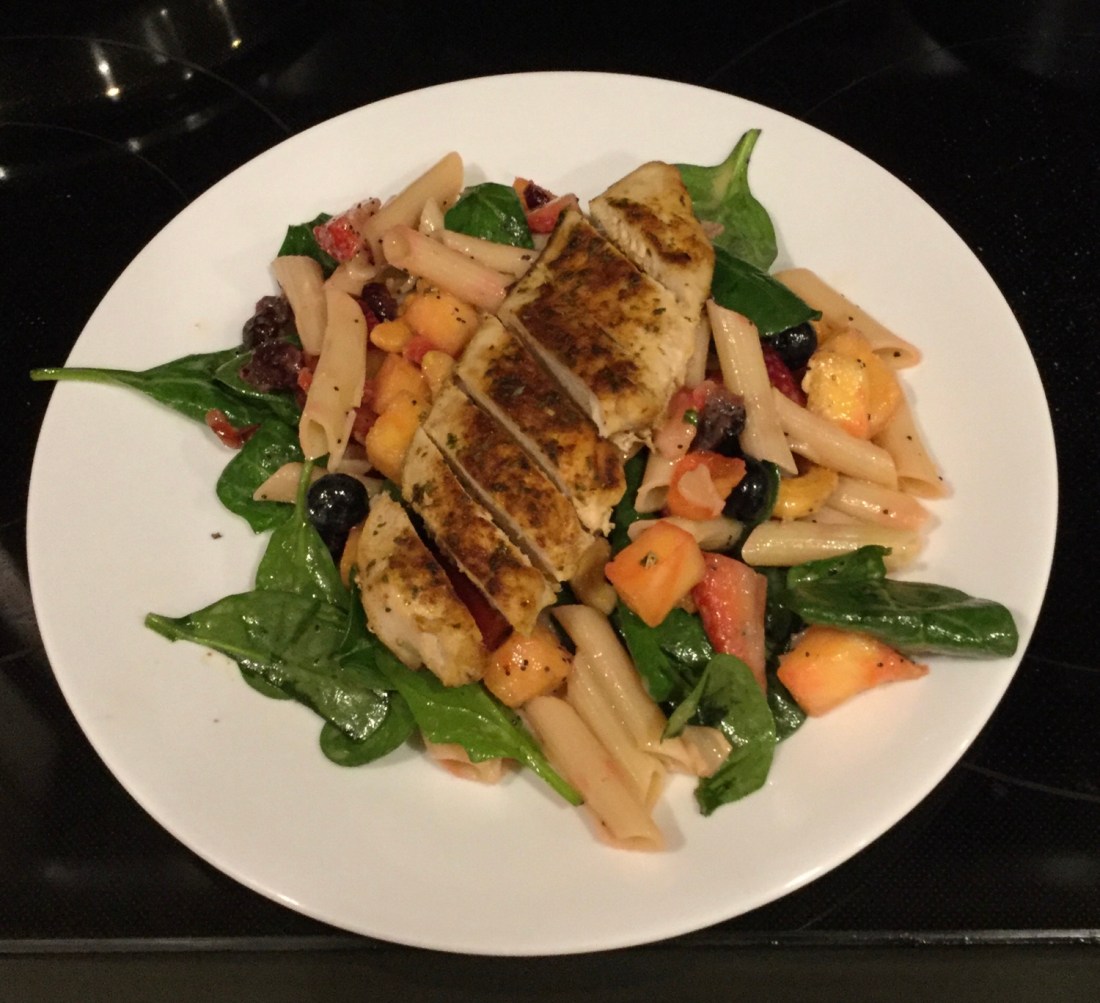I added some blueberries as I already had some and I also doubled the amount of strawberries and spinach and used gluten free penne. The dressing recipe made way too much. It could be halved or even quartered.