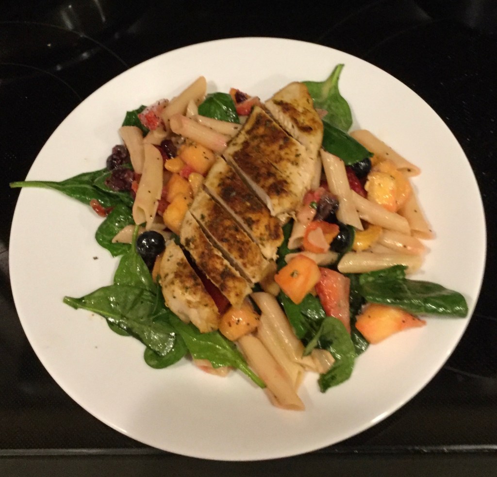 Strawberry Spinach Pasta Salad with Orange Poppy Seed Dressing and Oven Baked Chicken Breast