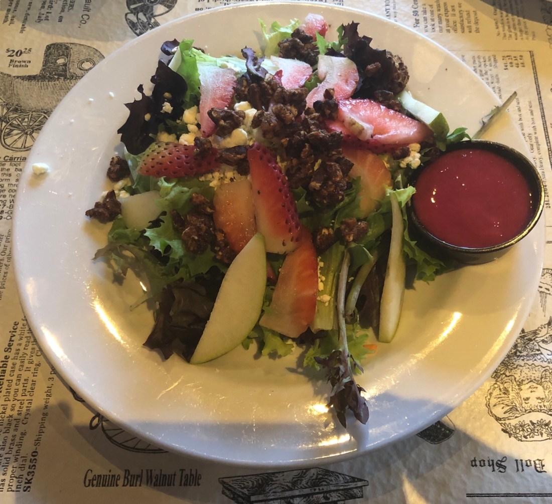 It was delicious. It was spring mix, goat cheese crumbles, candied pecans, fresh strawberries, and pear slices with a raspberry vinaigrette.