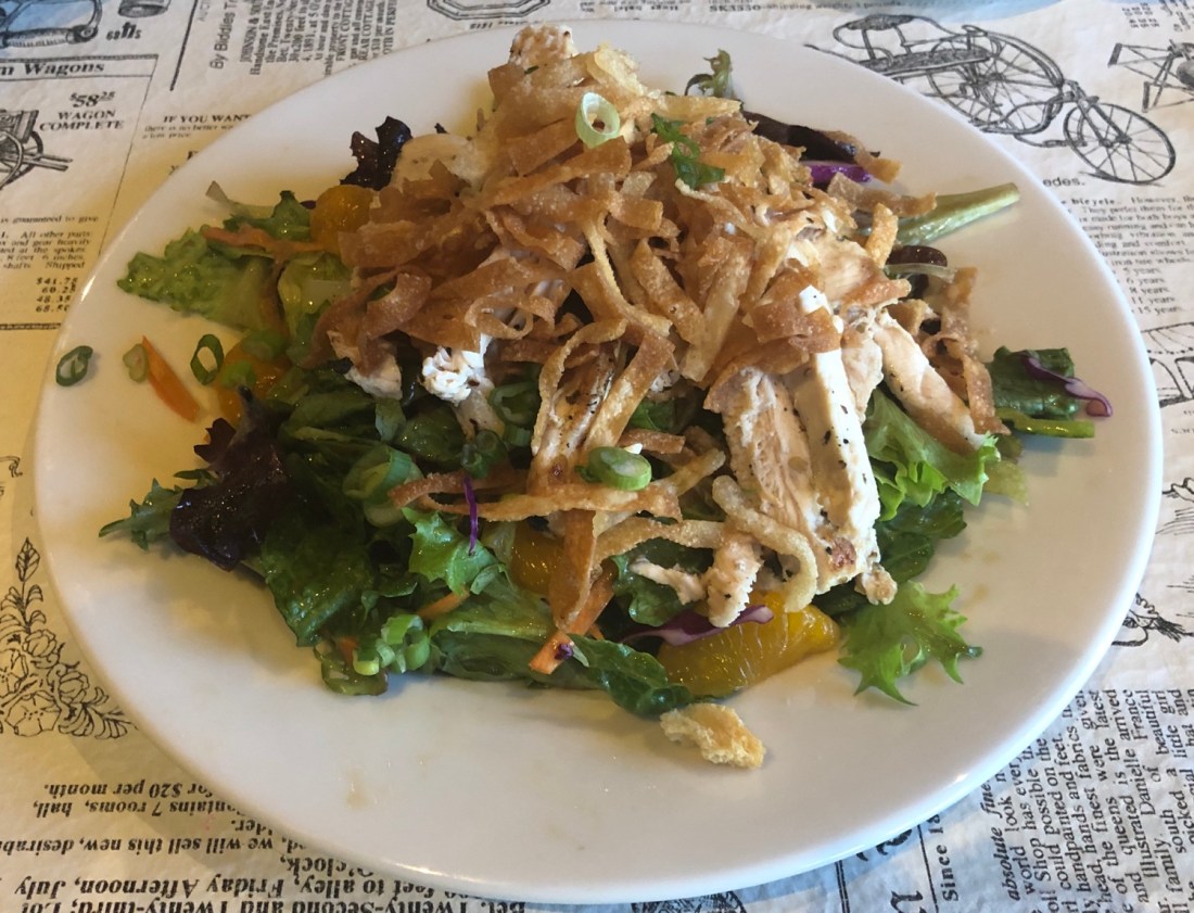 It was made of grilled chicken, lettuce, red cabbage, carrots, green onion, mandarin oranges, and crispy wonton strips with a sesame vinaigrette.