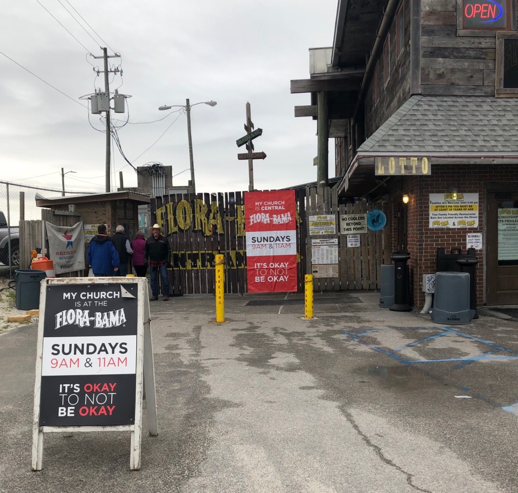 Yes. You read that correctly. Today we went to a church service held at the Flora Bama in Perdido Key, Florida. (The property straddles the Alabama and Florida state lines, meaning it’s one of the few bars in the country where you can have a drink in two states at once.) This is where they hold their weekly church services. And to answer your question – yes, you can get an alcoholic drink 🍹 at the church service. We didn’t. But we might have if we’d known at the time. It certainly would have been unique.