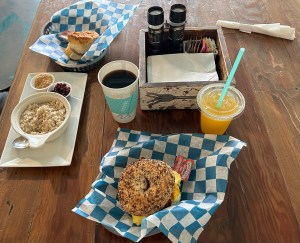 Mine: breakfast bagel and orange juice