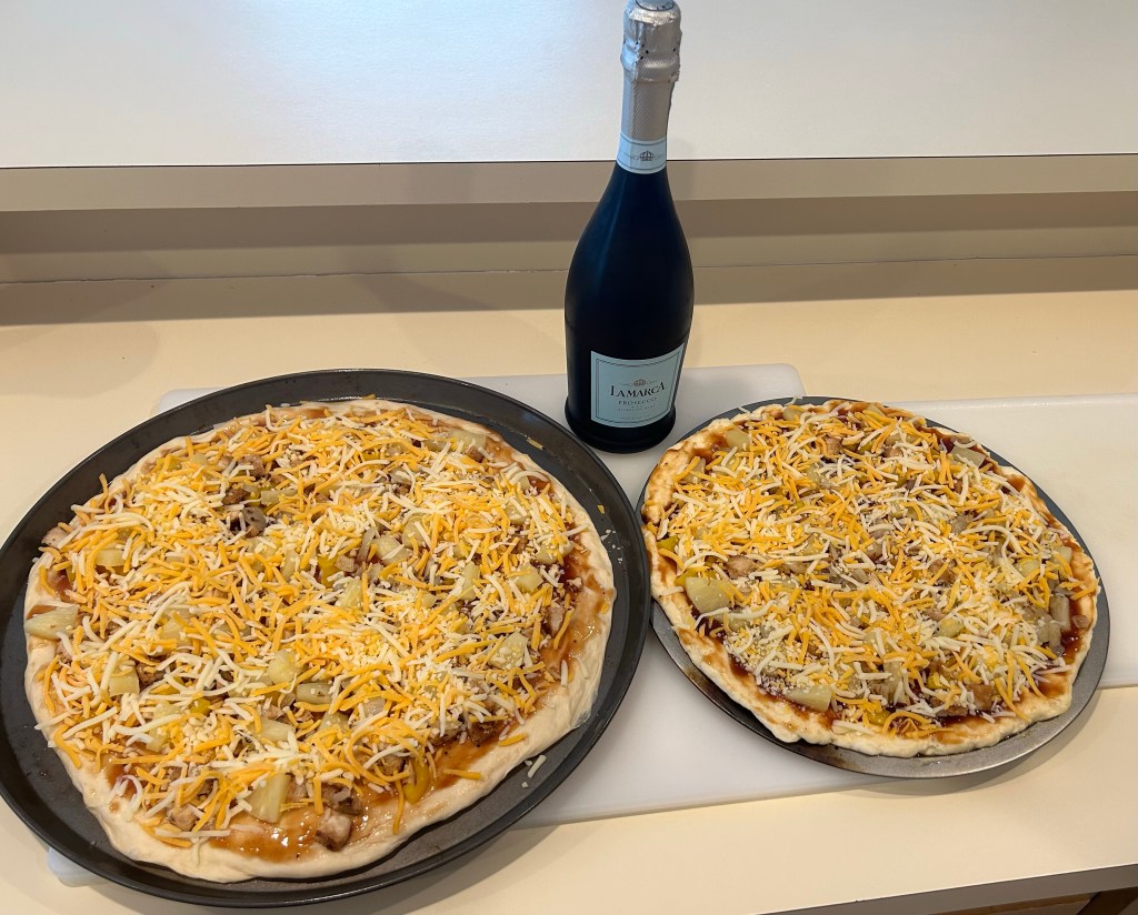 It’s a quiet night for us at the beach house after a sunny afternoon on the deck. On the menu is homemade pizza (the one on the right is gluten free) and Prosecco.