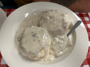 It was an interesting little spot with just a few people eating when we arrived but many more coming after us. It was very full by the time we left. Our first time here. When we’re down here we like to try new places as well as our favs. Very, very, very reasonable prices. My omelette with toast and panfries was $8. Richard’s biscuits and gravy was $7. Mine was tasty but Richard didn’t enjoy his. Huge, huge servings but that seems to be a theme down here. Richard called it “the breakfast equivalent to Lamberts Cafe”. Not quite but they were large servings.