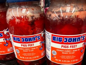 Pigs Feet. Yes you read that correctly. Again I’d heard of them but they were new to me in a grocery store. Hmmm. I wonder. Maybe at home I don’t pay enough attention to what’s on the shelf. Probably. I am not the most observant person. I do remember many, many, many years ago travelling through the province of Quebec https://en.wikipedia.org/wiki/Quebec with my in-laws and stopping at a restaurant where my father-in-law ordered pig’s knuckles. He was super excited as he always liked to have them when in Quebec. Have to admit I was grossed out.