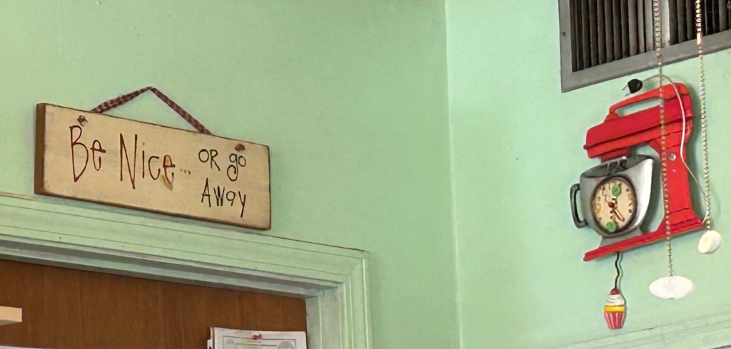 Ever notice how you can go to places again and again and always see something new. I guess I do as I’m not the most observant person. Let’s face it. I’m not observant at all. My mind is usually somewhere else. Often singing a song. Oblivious to all around me. I have to give Richard credit for pointing the following wall hangings out to me. Take special note of the bottom one.
