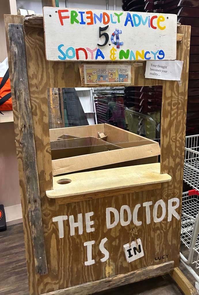 The first time we visited here in. 2019 I went to an advice booth. What a hoot. Just like You’re a Good Man Charlie Brown. It’s no longer there but when I went to the bathroom (as I do most places I visit – gotta love getting older) I found the advice booth hidden on the way there.