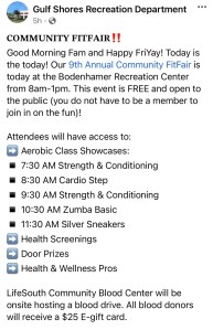 Every year Gulf Shores has a Community FitFair that takes place at the Bodenhamer Recreation Center. That’s the place where we do yoga classes, and the gym. Consistent physical activity helps with body, mind, and spirit. I guess similar to keeping my mind active by doing Wordle and crossword puzzles everyday. And my blog.
