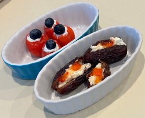 To top off the week we had friends over for dinner. Always a great time. And wonderful for the spirit. As usual I forgot to take pictures of the full meal which is so annoying but here’s what was left of the appetizers. Peppadews https://eatdelights.com/what-are-peppadews/ stuffed with cream cheese and topped with a blueberry. Medjool dates https://en.wikipedia.org/wiki/Medjool stuffed with cream cheese and topped with red pepper jelly. My daughter gave me the date recipe. It’s usually done with goat cheese but since I already had cream cheese that’s what I used this time.