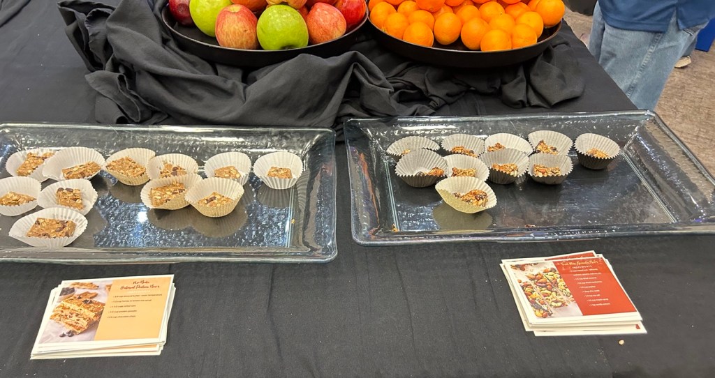 There were various displays from health and wellness organizations/health practitioners/local companies. This was our fourth year attending and it seemed there were fewer displays. That was too bad. Of course there’s nothing like offering free items to get people to view their information. Free note pads, pens, t shirts, jar openers, fridge magnets, plus draws for free goodie baskets and gym memberships.