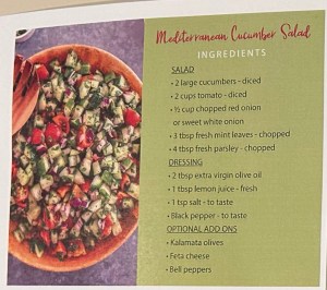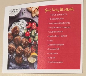 Late morning was fruit, Greek salad, and turkey meatballs. I did my best to take some photos so you could see the recipes if you’re interested. Everything was delicious.