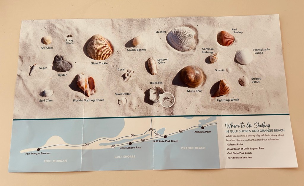 At the Gulf Shores Information Centre, like all information centres, they have numerous brochures/pamphlets. Interesting. Richard saw a shell brochure and thus sprung our beach project – find the shells shown in the brochure. Also at this centre, if you ask, they will give you a shelling bag.