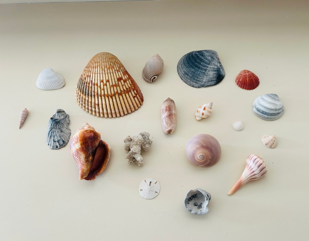 Bottom: Coral, two shells joined together, and a etched shell that we nicknamed our turtle shell.