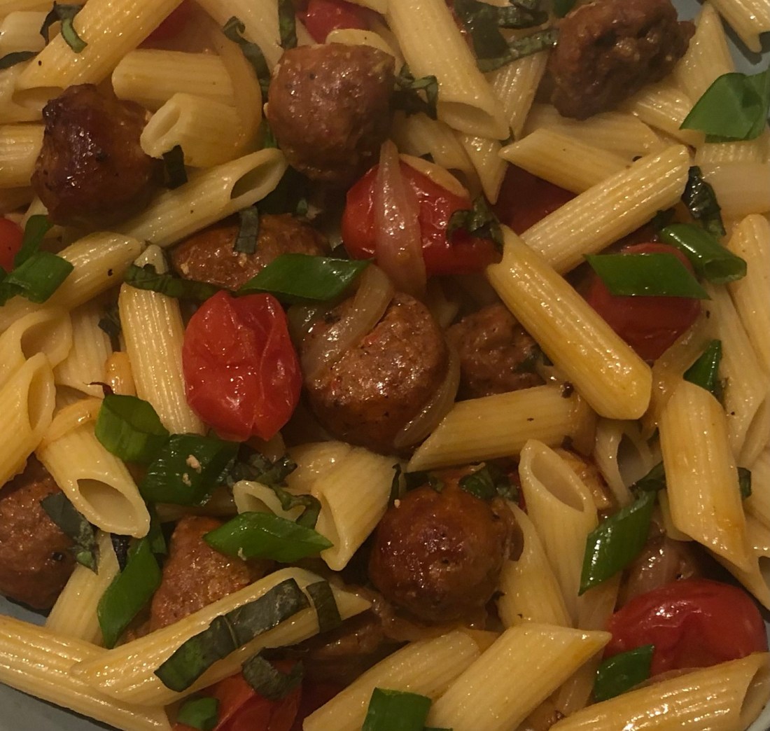 Roasted Cherry Tomato Penne with Italian Sausage and Fresh Basil from Chef Michael Smith’s Kitchen cookbook.